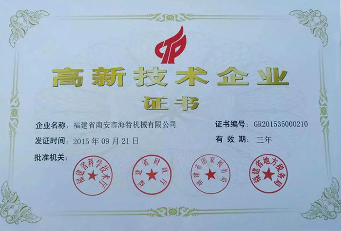 2015年12月8日,福建省科技廳政府信息公開網(wǎng)公布福建省科學(xué)技術(shù)廳通知文件(閩科高[2015]37號(hào)):根據(jù)《高新技術(shù)企業(yè)認(rèn)定管理辦法》(國(guó)科發(fā)火[2008]172號(hào))和《高新技術(shù)企業(yè)認(rèn)定管理工作指引》(國(guó)科發(fā)火[2008]362號(hào))有關(guān)規(guī)定以及《關(guān)于福建省2015年第一批高新技術(shù)企業(yè)備案的復(fù)函》(國(guó)科火字[2015]235號(hào)),認(rèn)定海特機(jī)械有限公司為福建省2015年高新技術(shù)企業(yè)。