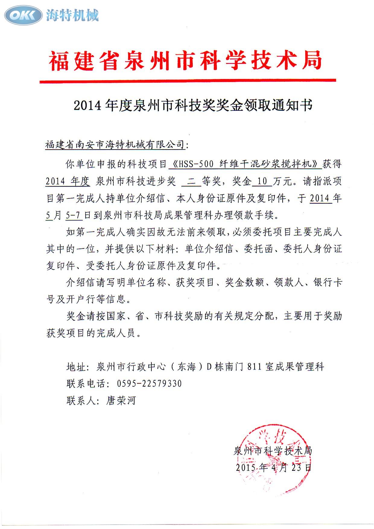 2014年 纖維攪拌機 泉州市科技進步獎二等獎