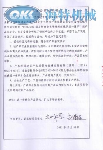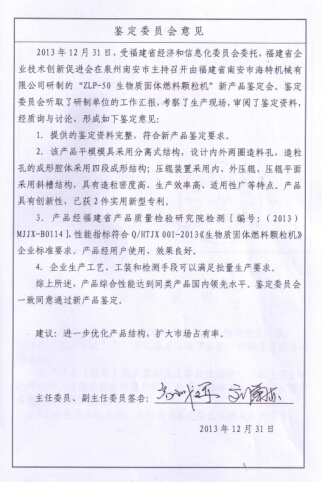 2013年三項產品, 生物質固體燃料顆粒機、纖維干混攪拌機、 鋁及鋁合金熔煉保溫一體爐經福建省新產品新技術鑒定為國內領先水平